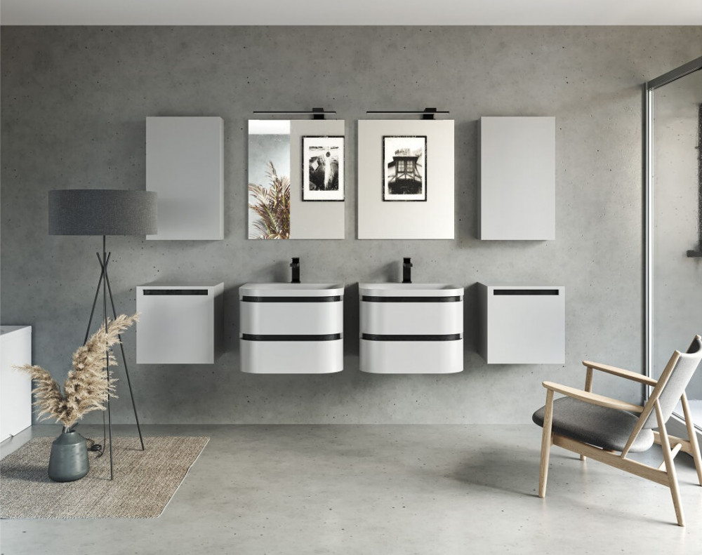 Vittoria представлена у трьох одноколірних декорах – білому, бежевому та темному. Відчуття гламуру додатково підкреслюється лакованими лицьовими сторонами елементів. Для більш просторих ванних кімнат пропонуємо шафиподвійна ширина з м'яким закриттям, стильно доповнена частково інтегрованими ручками.
