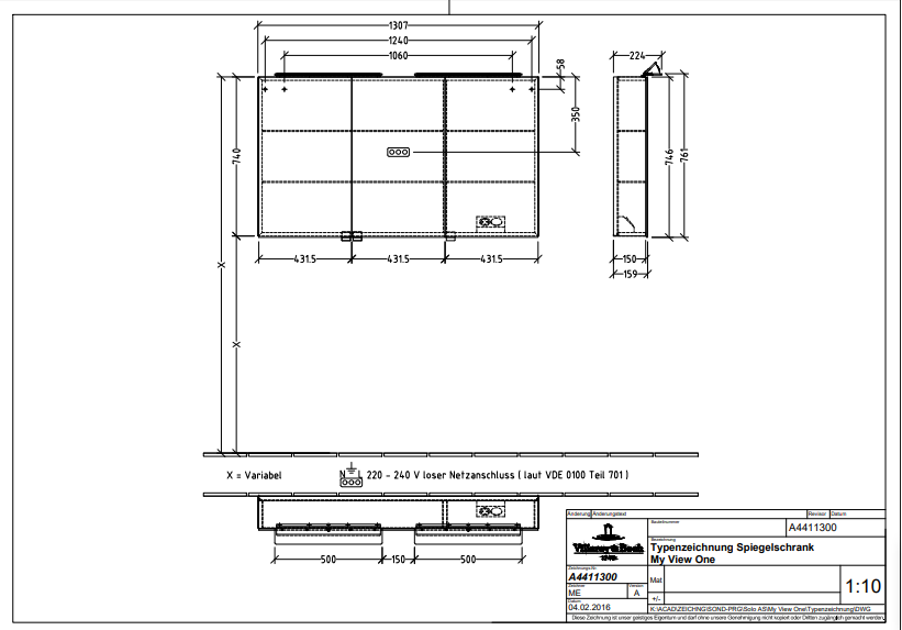 Шафка для ванної Villeroy & Boch My View Now 130,7x74,6 см з підсвічуванням алюміній/дзеркало A4411300