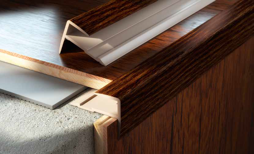 Естетична і фукціонального обробка сходів, профіль С34 захищає їхні краї від механічних пошкоджень, є протиковзким, ідеально підходить для обробки щаблів, виконаних з ламінату або паркету.
