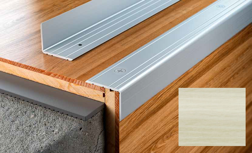 Сходовий профіль S02 з подовженою вертикальною частиною, краще захищає кути і маскує нерівності країв ступенів.