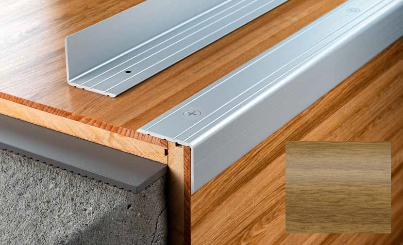 Сходовий профіль S02 з подовженою вертикальною частиною, краще захищає кути і маскує нерівності країв ступенів.
