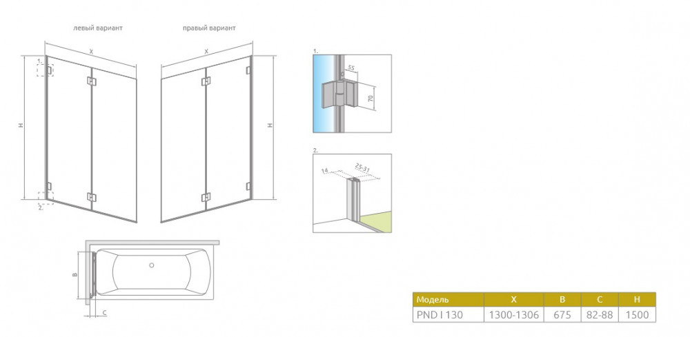 - Скло кріпиться до стіни за допомогою пристінних профілів (з регулюванням)