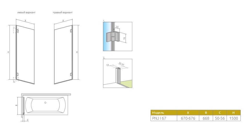 - Скло кріпиться до стіни за допомогою пристінних профілів (з регулюванням)