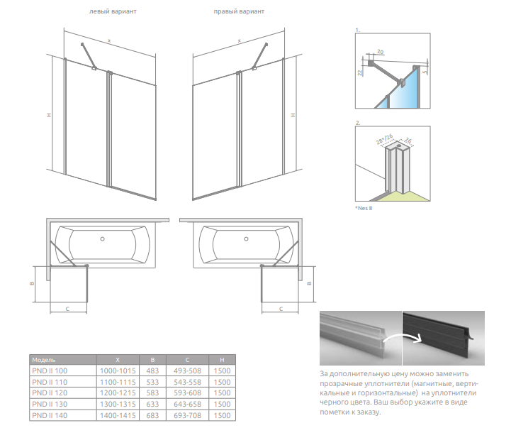 Колекція Nes це одна з найуніверсальніших і різноманітних колекцій душових кабін, дверей та шторок. Стулки дверей у цій колекції відкриваються і всередину, і назовні. Профілі та фурнітура на вибір або в кольорі "хром", або "Black". Товщина скла 6-8 мм. За стандартом скло прозоре або Frame/Factory.