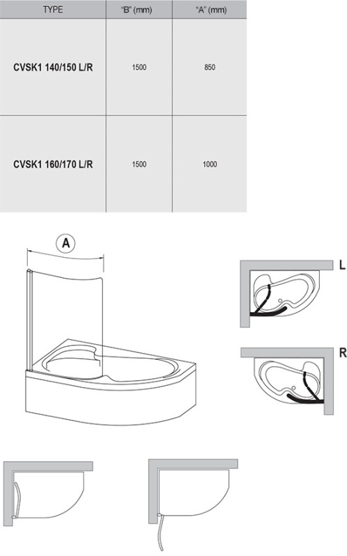 - Розміри: 85 см для ванн 140, 150 см; 100 см для ванн 160, 170 см