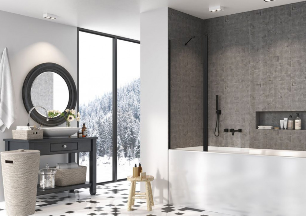 Nes Black — це кабіни, двері та шторки на ванну — з фурнітурою в кольорі «Black». Додатково кілька моделей Nes Black доступно зі склом Frame/Factory, на якому чорні смужки виготовлені зі стійкої, керамічної фарби.