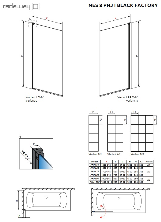 1) Шторка для ванни Radaway Nes 8 Black PNJ I Factory 80 ліва чорний / скло Factory