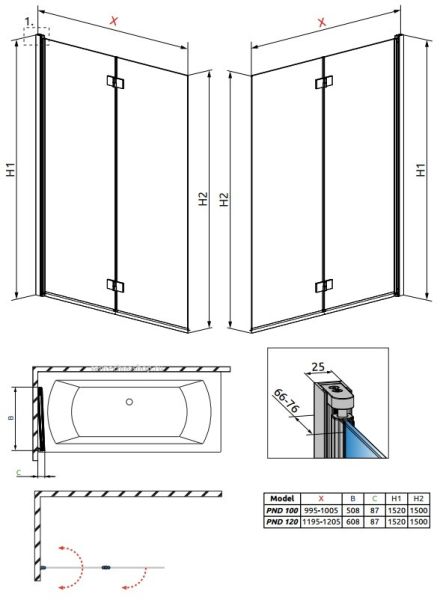Radaway Essenza PND це двостулкова шторка дляванни. Основною особливістю даної моделі є те що у неї рухливі обидва сегмента, Душову шторку можна або скласти гармошкою всередину ванни або відчинити назовні. Модель виконана з безпечного загартованого скла товщиною 6 мм з нанесеним брудовідштовхуючими покриттям EasyClean . Штора Essenza PND доступна тільки в прозорому склі, інші варіанти стекол доступні по спец замовленню.
