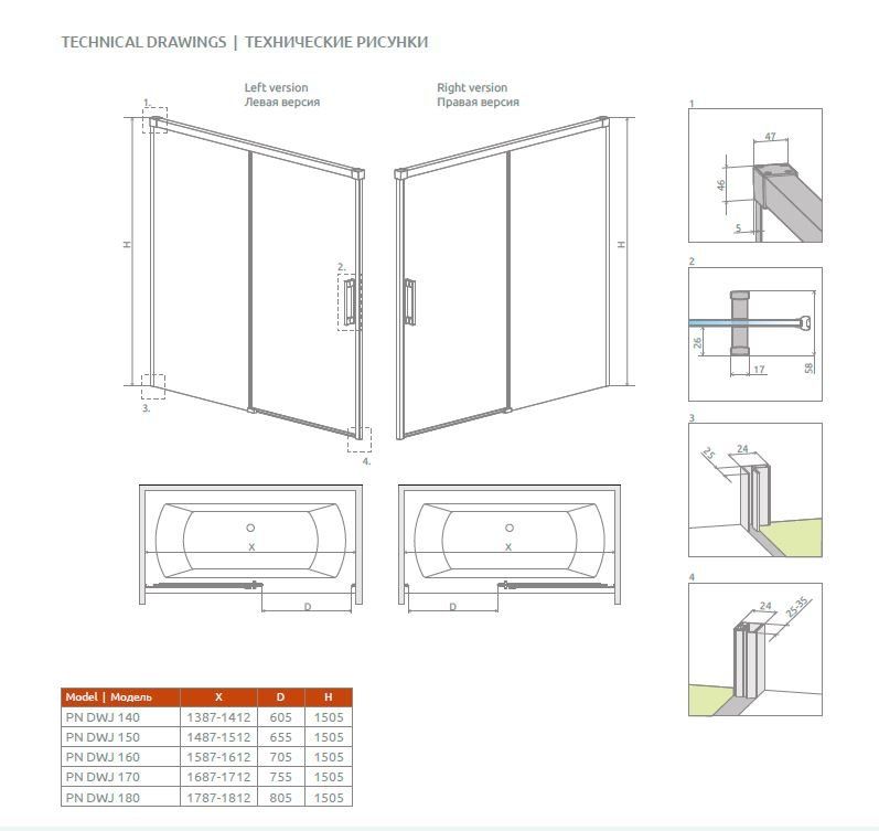 - Скло кріпиться до стіни за допомогою пристінних профілів (з регулюванням)