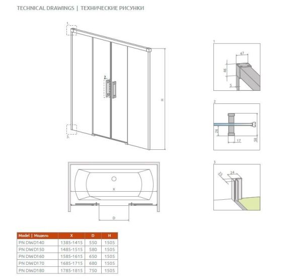 - Скло кріпиться до стіни за допомогою пристінних профілів (з регулюванням)