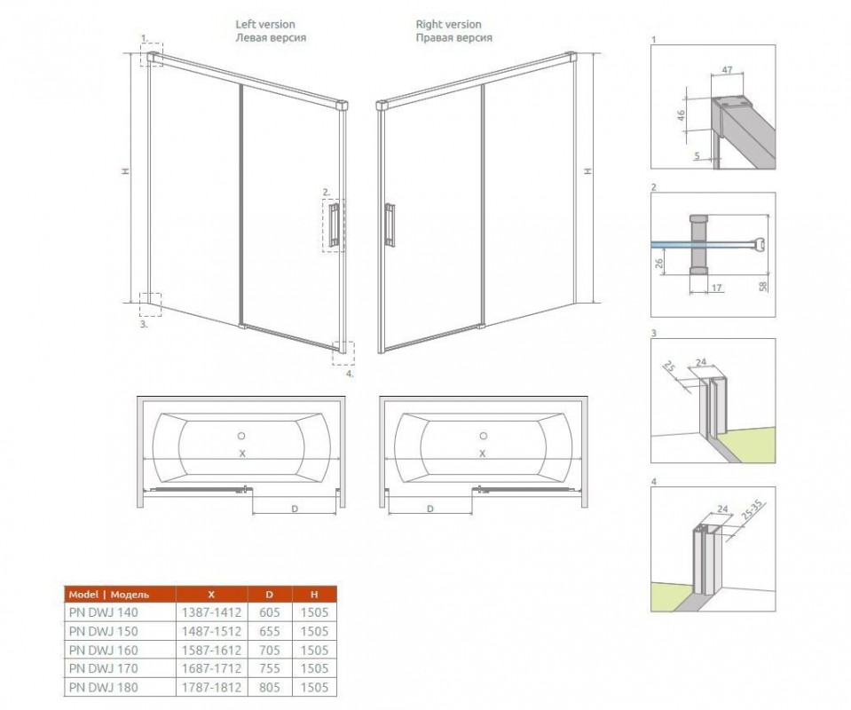 1) Шторка для ван ної Radaway Idea PN DWJ 180 права прозоре скло / хром