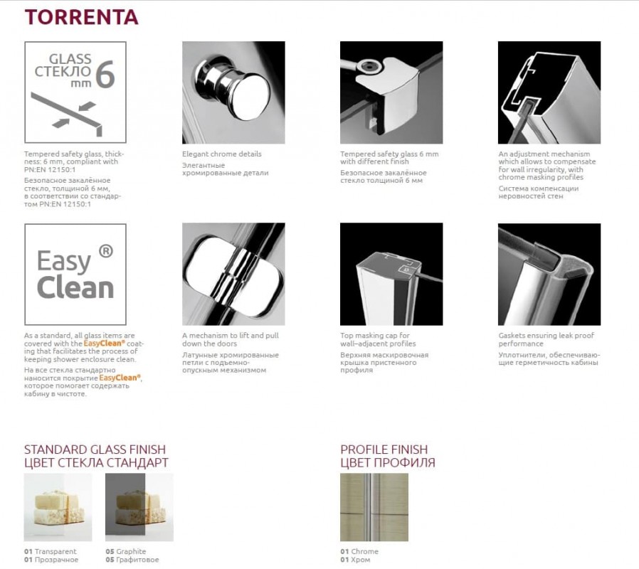 Torrenta PND - це серія двосекційних шторок з одного орної назовні дверима, яка підвішена на латунні хромовані петлі з підйомно-опускним механізмом і системою позиціонування дверей. Високоміцне загартоване скло товщиною 6 мм з покриттям Easy Clean забезпечать надійність експлуатації виробу і простоту в догляді за ним. Міцні алюмінієві стабілізатори гарантують стабільнуконструкцію кабіни, а елегантні хромовані деталі гармонійно доповнять композицію інтер'єру сучасної ванної кімнати.