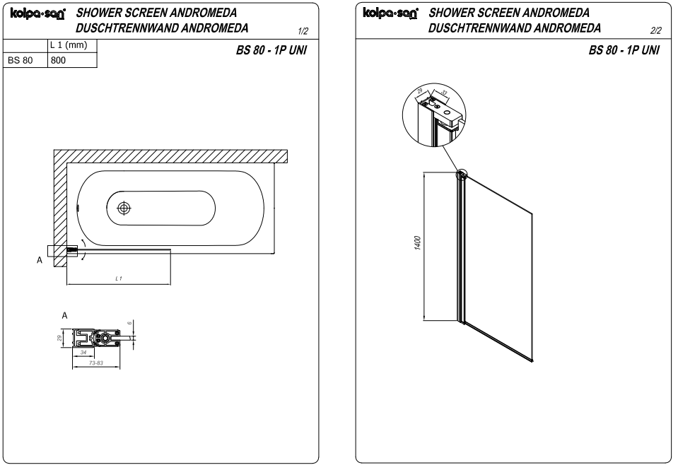 1) Шторка для ванни Kolpa San Andromeda BS 80-UNI SBR 80х140 см срібло прозоре скло
