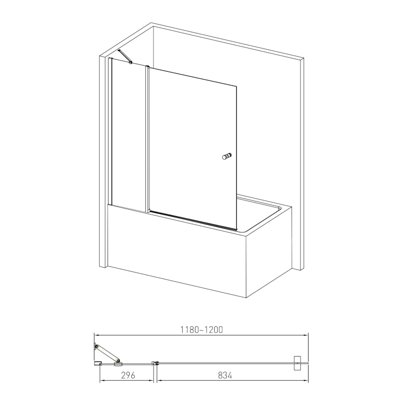 1) Шторка на ванну 120 см з одним нерухомим елементом і поворотним Volle скло прозоре