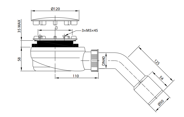 - Кут вигину зливної труби 45°