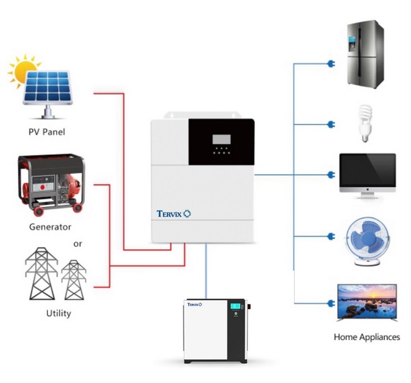 Як приклад візьмемо таку систему – загальнаелектромережа + Tervix BANKA Pro Line (5,1 кВтг) + сонячні панелі + генератор.