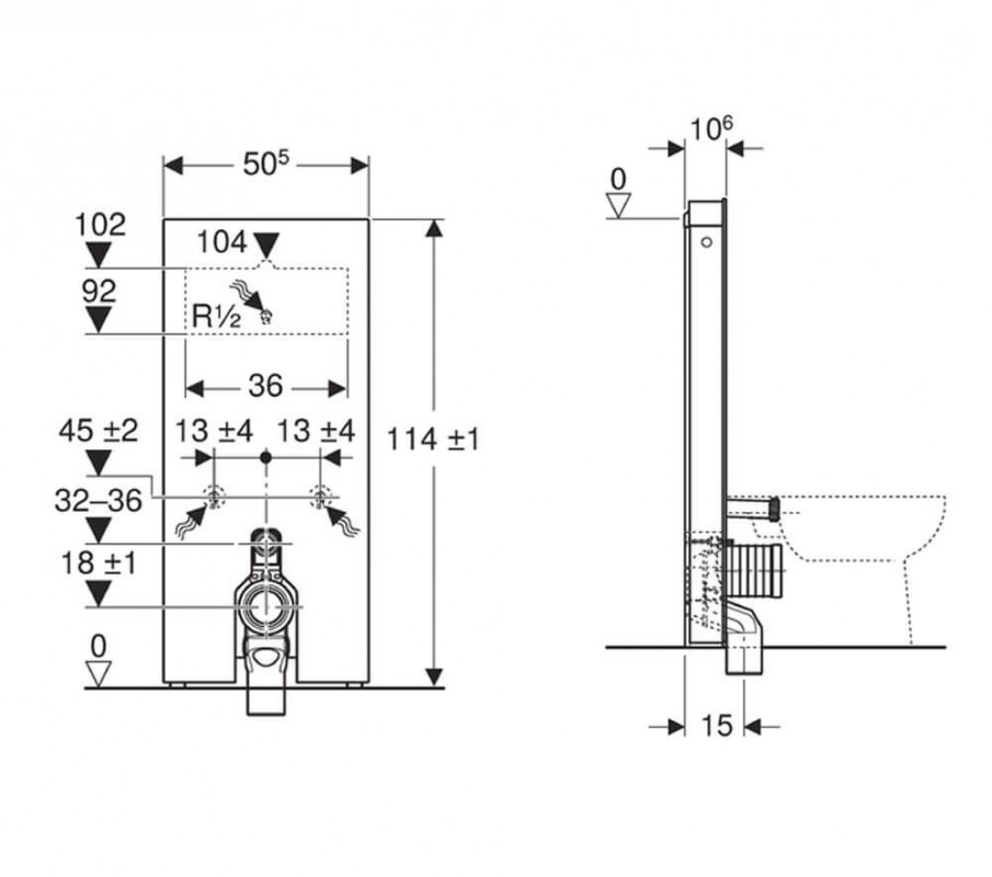 - Для заміни підлогових унітазів зі бачком прихованого монтажу з макс. висотою вікна технічного обслуговування <109 см