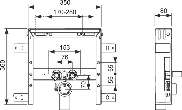 - Регульовані центри кріплення умивальника