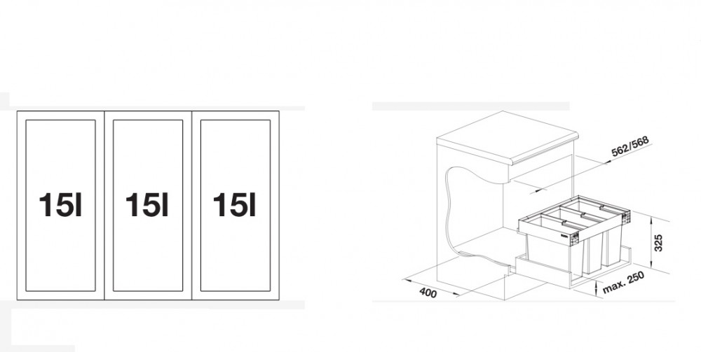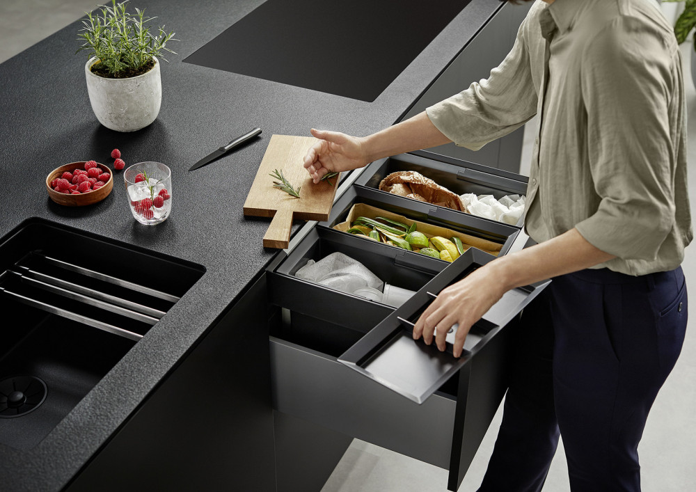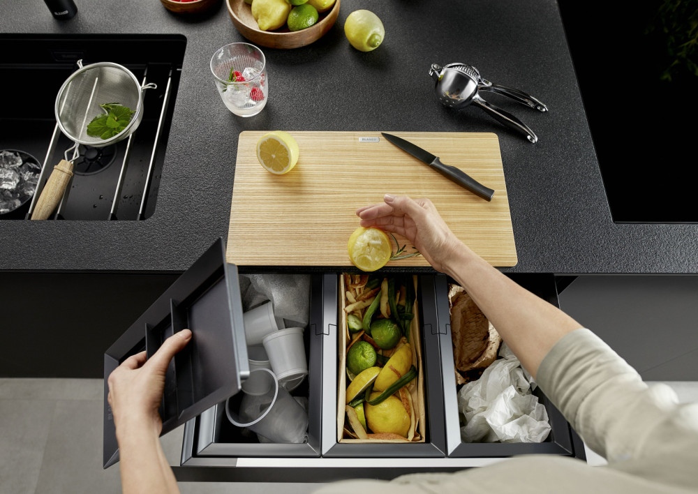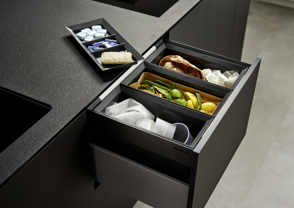 - Різноманітні варіанти поділу та зберігання відходів за рахунок гнучких комбінацій відро для сміття з меншими вимогами до простору в тумбі під мийкою.
