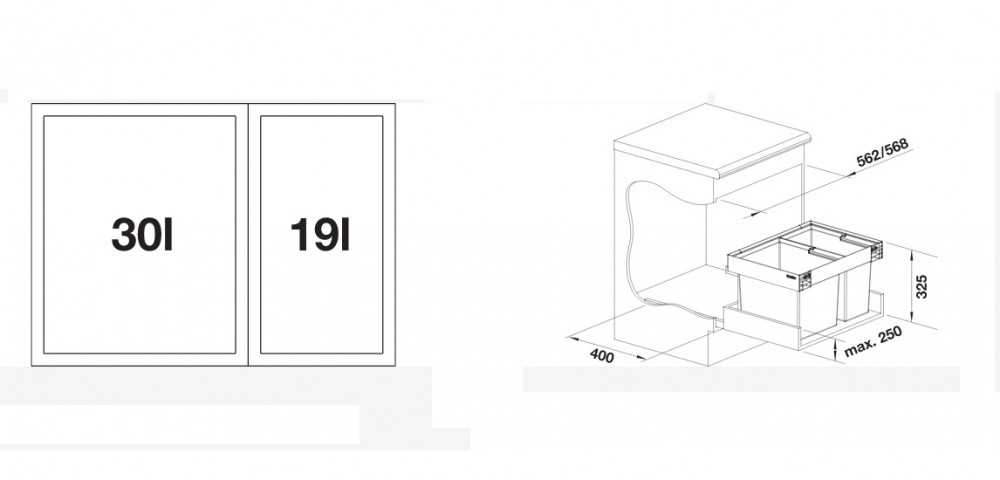 - Різноманітні варіанти поділу та зберігання відходів за рахунок гнучких комбінацій відро для сміття з меншими вимогами до простору в тумбі під мийкою.