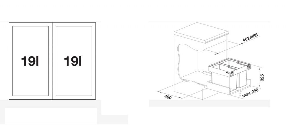 - Різноманітні варіанти поділу та зберігання відходів за рахунок гнучких комбінацій відро для сміттяменшими вимогами до простору у тумбі під мийкою.