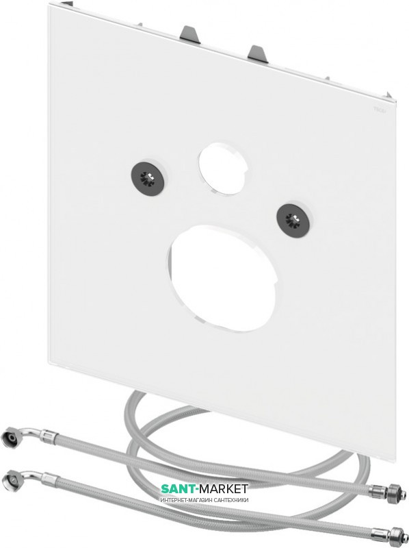 Нижча скляна пластина для комбінації з керамікою туалету TECEone з функцією зливи, включаючи набір ядрового ізоляції і посилені шланги для гарячого з'єднання холодної води до звичайних кутовим клапанів.