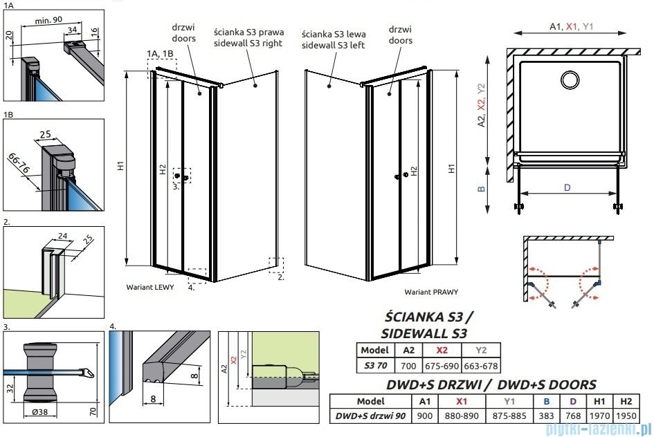 - Для створення душової кабіни необхідна комбінація бокової стінки S3 з душовими дверима DWD+S