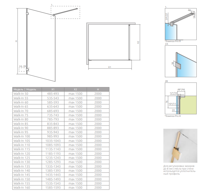 Essenza Pro Gold — колекція кабін різних форм, дверей та шторок, в яких стаціонарне скло закріплене до стіни за допомогою кронштейна, а не профілю. Допустимі два варіанти монтажу: з ущільнюючим профілем, або без нього. Стул двері підвішений на латунних петлях і відкривається тільки назовні.