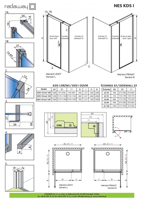 1) Стінка душова Radaway Nes KDS I S3 90 см хром / прозоре скло