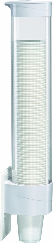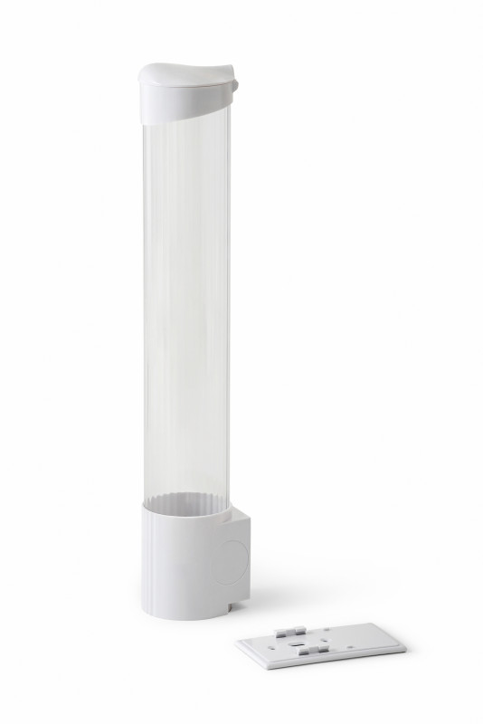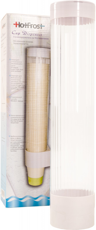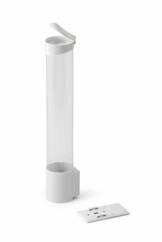 Ємність для стаканчиків виготовлена із прозорого пластику, а кришка та кріпильна частина із пластику білого кольору.