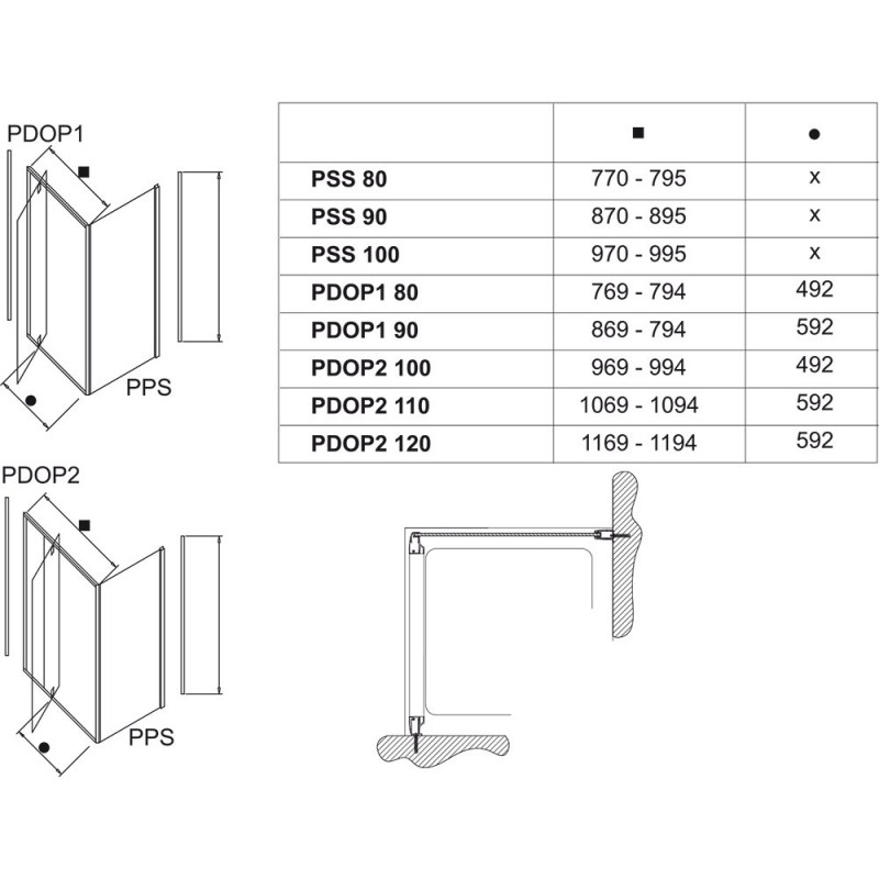 Виріб складається з однієї нерухомої частини. Встановлюється в облицьований кахлем кут ванної кімнати (в комбінації з душовими дверима) на піддони RAVAK ANGELA, PERSEUS, PERSEUS PRO, PERSEUS PRO FLAT, PERSEUS PRO CHROME, GIGANT PRO, GIGANT PRO FLAT, GIGANT PRO CHROME або безпосередньо на підлогу з вбудованим душовим каналом або трапом. Комбінація двох нерухомих стінок і душових дверей PIVOT дозволяє створити "П" - образну душову кабіну.Який регулює профіль PNPS дозволяє розширити виріб на