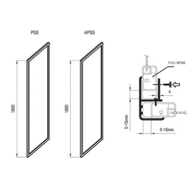 Нерухому стінку PSS можна комбінувати з душовими дверима висотою 1850 мм (SDZ2, SDZ3, SDOP) для створення «Г» -образного душового куточка. За допомогою двох нерухомих стінок PSS і душових дверей (SDZ2, SDZ3, SDOP) утворите «П» -подібний душовий куточок. Можливо виготовлення атипових душових дверей і нерухомої стінки.