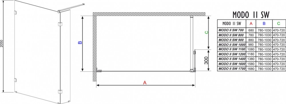Modo II складається зі скла, прикріпленого збоку до стіни за допомогою профілю і одного стабілізатора, з додатковою вузької стінкою.