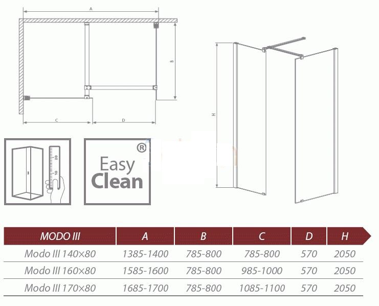 Modo III- це комбінація двох стекол, що створює прямокутну кабіну з просторим входом. З боків скло кріпитися до стін за допомогою профілів. Додатково конструкція кабіни укріплена верхніми стабілізаторами. Варто звернути увагу на обертається частина стабілізатора. Це дозволяє встановити кабіну, коли скло не вартопаралельно до протилежної стіни.