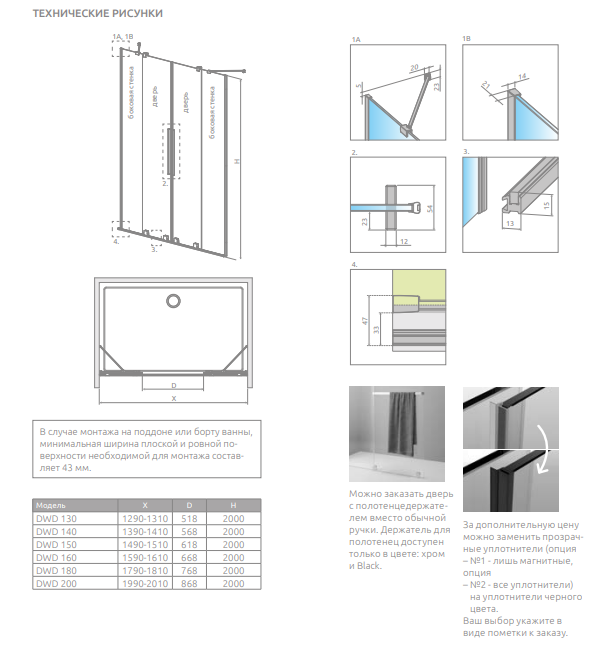 У замовленні треба вказати два номери артикулів: двері та стінки. Модель DWD можна замовити в декількох варіантах - з більш широким або вузьким входом.