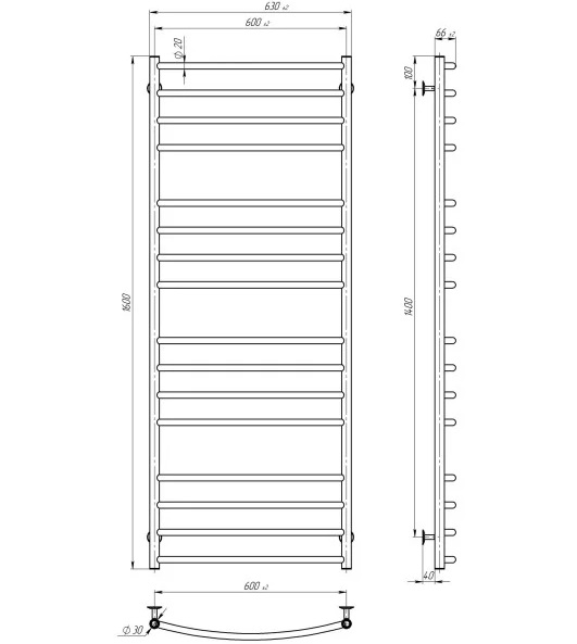 Сушка для рушників водяна Deffi Класик Еліт П16 600х1600 бічне праве підключення хром C.KE.160.60.16.C.C