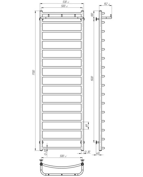 Сушка для рушників водяна Deffi Класик N П16 500х1700 бічне праве підключення чорний C.KN.170.50.16.B.C