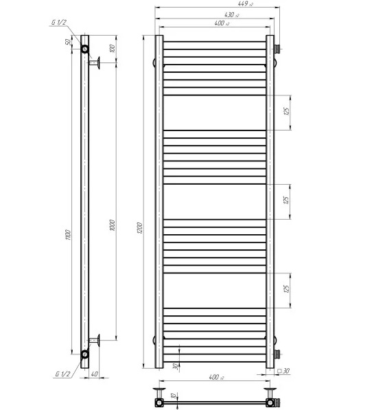Сушка для рушників водяна Deffi Magnus П16 400х1200 бічне праве підключення білий A.MA.120.40.16.W.C
