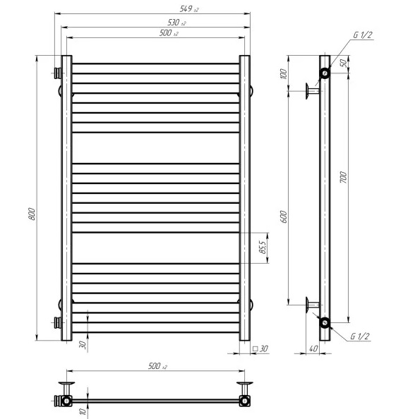 Сушка для рушників водяна Deffi Magnus П12 500х800 бічне ліве підключення білий A.MA.80.50.12.W.B