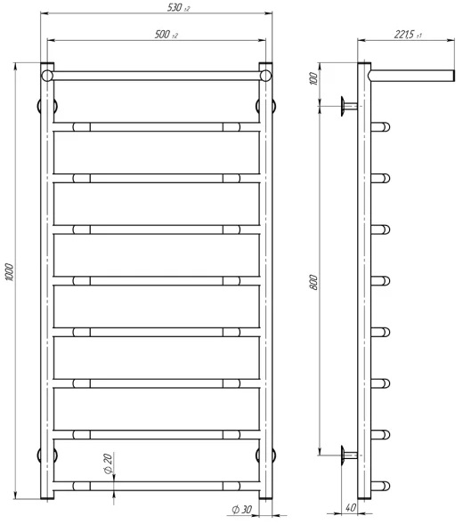 Сушка для рушників водяна Deffi Трапеція з полицею П9 500х1000 бічне праве підключення білий C.TP.100.50.9.W.C