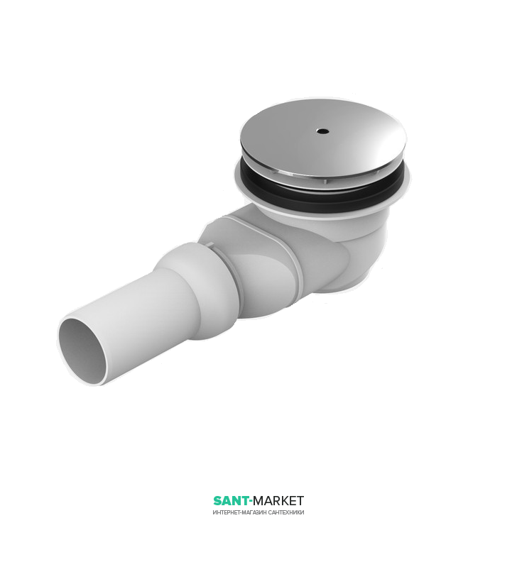 З пластику, в комплекті з декоративною кришкою з хромованим покриттям, знімною насадкою для сифона, плоскою прокладкою, виходом з регульованим шаровим шарніром, відведенням O 40/50 мм, для душового піддону, пропускна здатність - 0,75 л/сек. У коробці.