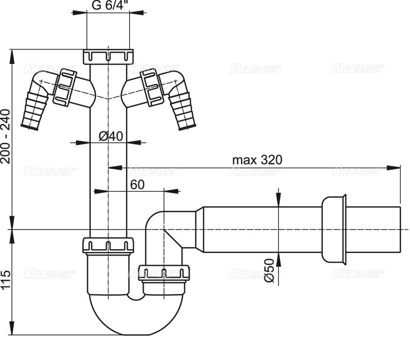 Сифон для мийки AlcaPlast з накидною гайкою 6/4 "і двома штуцерами