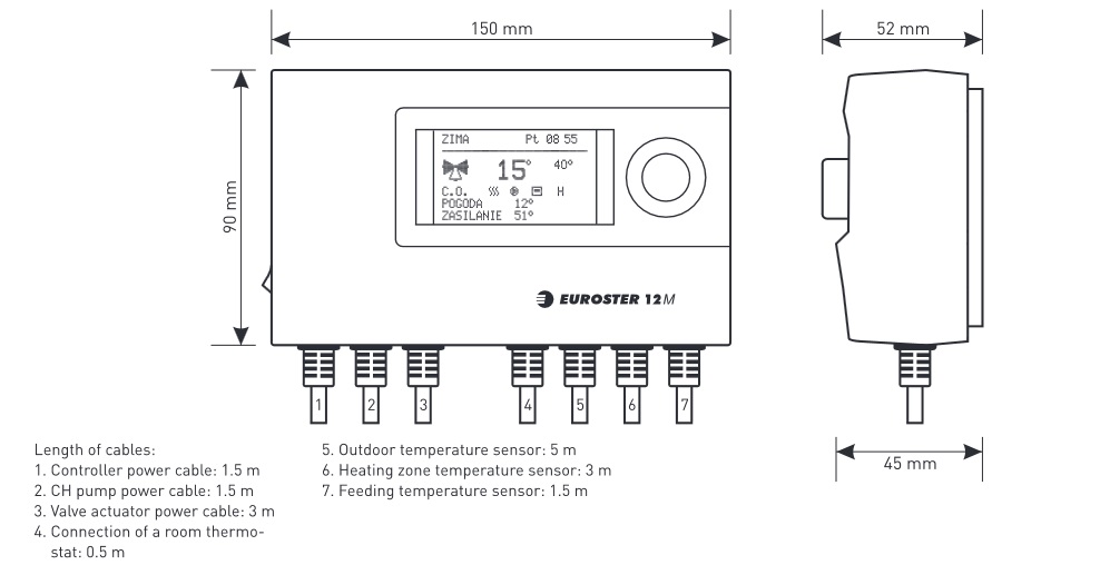 Euroster 12M - це програмований погодний контролер для керування температурою опалювального контуру за допомогою 3-х або 4-х ходових клапанів та управління циркуляційним насосом центрального опалення. Система оснащена рядом корисних функцій, наприклад: тимчасове включення контуру із заданою температурою (підігрів підлоги, швидке обігрів приміщень), автоматичне включення тавимикання обігріву в залежності від температури зовнішнього повітря, захист від перегріву контуру або сигналізація аварійних ситуацій. Euroster 12M має антистопорну насосну систему, що запобігає заклиненню крильчатки насоса, що не використовується. Після закінчення опалювального сезону система автоматично запускає насос кожні два тижні на 30 секунд (щоб система працювала після сезону, контролер слід залишити увімкненим).