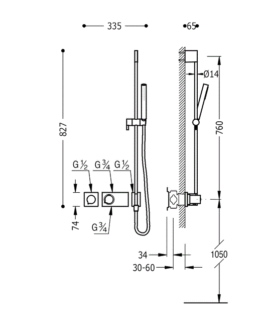 - Змінна штанга з настінним водозабором. Довжина 760 мм