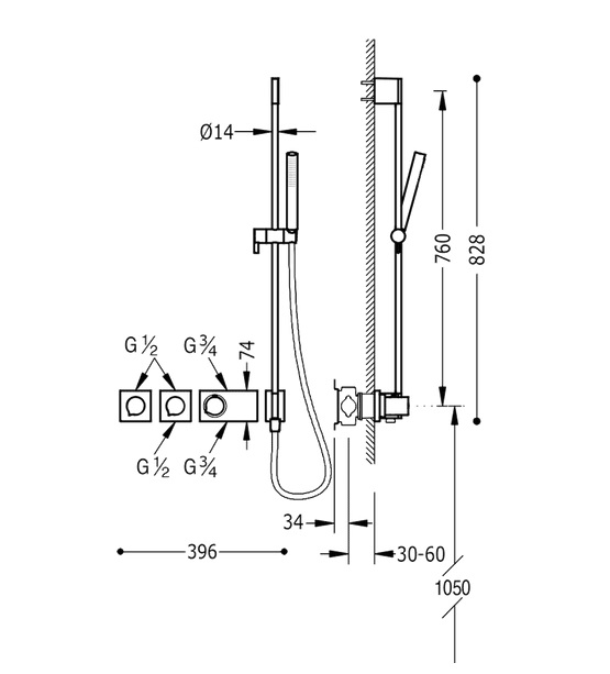 - Змінна штанга з настінним водозабором. Довжина 760 мм