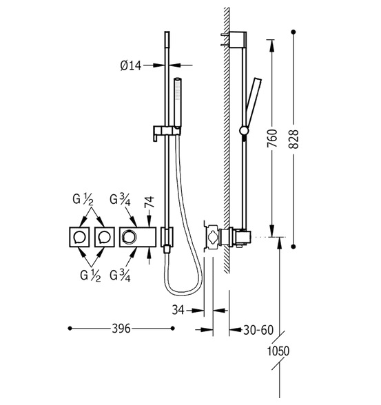 - Змінна штанга з настінним водозабором. Довжина 760 мм