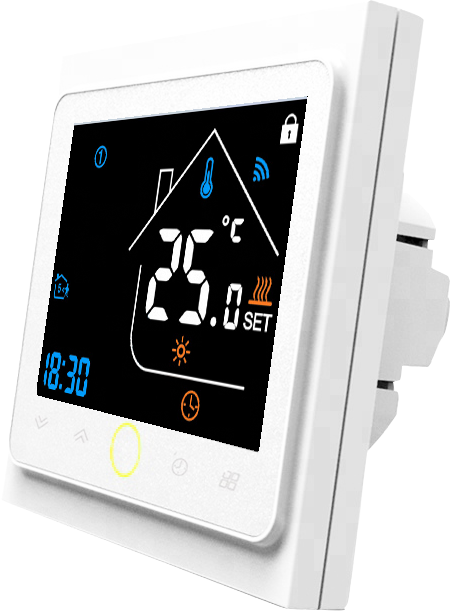 Інтелектуальний регулятор температури з кольоровим дисплеєм та функцією тижневого програмування дозволяє встановити чотири періоди часу та відповідно чотири значення температури в один день (робочі дні + субота + неділя). Також можна вибрати ручне керування або режим автоматичного керування (відповідно до налаштувань). Термостат легко програмувати, керувати тадистанційно контролювати з будь-якого місця, де є інтернет. Оскільки термостат обладнаний клемою без напруги (сухий контакт 16А) і підтримує функцію нагрівання/охолодження, він може використовуватися для керування газовим котлом, керування електричним котлом/бойлером, керування системами охолодження і т.д.