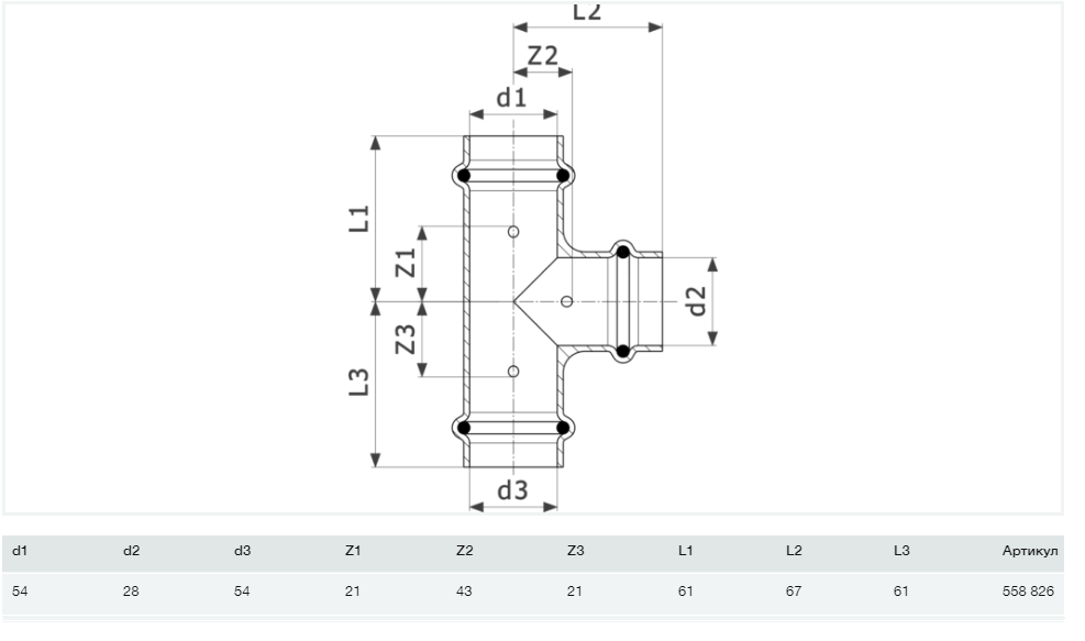1) Трійник Viega Prestabo 1118 54х282х54 нелегована сталь