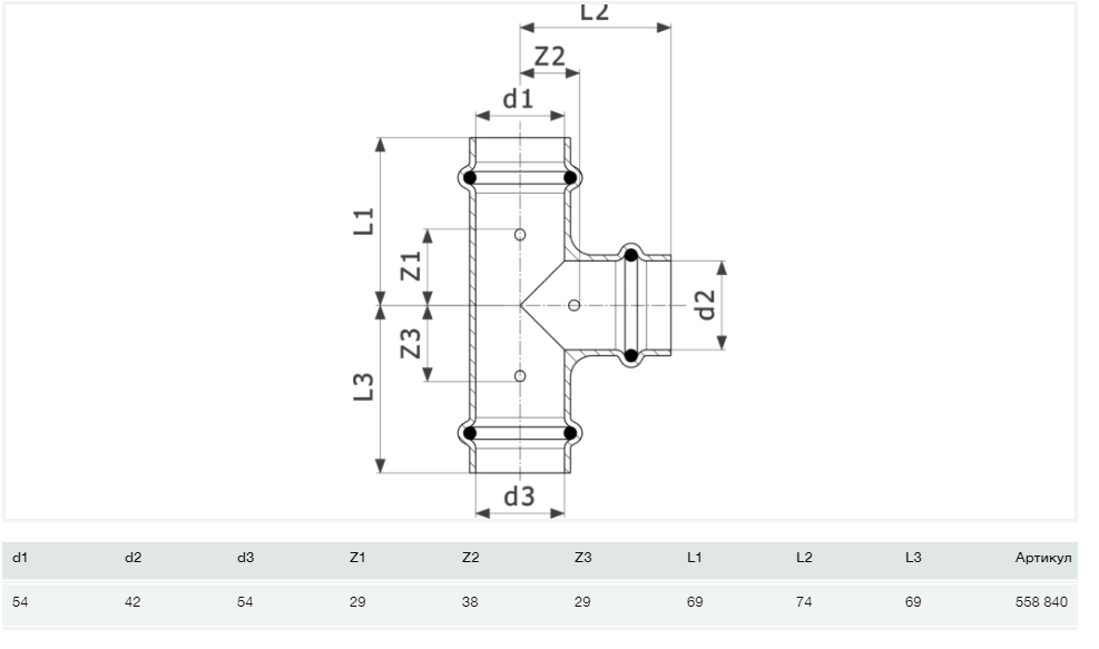 1) Трійник Viega Prestabo 1118 54х42х54 нелегована сталь