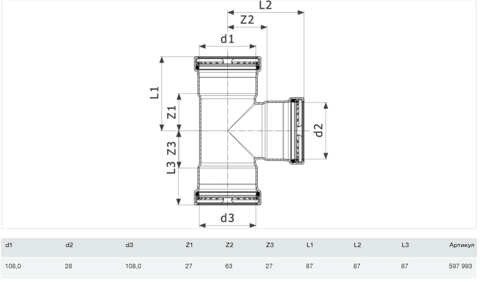 Трійник Viega Prestabo XL 1118XL 108х28х108 нелегована сталь 597993
